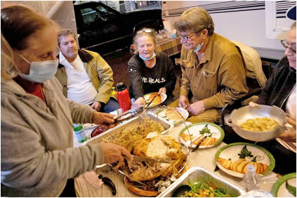 Dorothy Glaros (left) serves her friends and former Spanish Flat Mobile Villa residents Rich Woodard, Michele Quecke, Daniel Davenport and Catalina Tercero an early Thanksgiving dinner at the Napa Valley Expo fairgrounds, where they’ve been allowed to park their vehicles. | Jessica Christian / The Chronicle