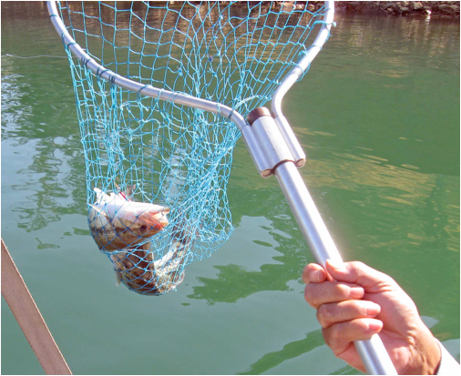 We finally took off for the Narrows where Sid gave me lessons in the basics – knot tying, lure types, how not to hook the back of your head when casting. We trolled slowly along the shore looking at the depth finder and Sid telling me to say “bottom, bottom” every time my rod bounced. I thought I was getting nibbles but I was only bouncing on the rocks along the shore. But the next time I was about to say “bottom” the rod stayed bent! I grabbed it and reeled in what I thought was a big fish. When Albert got the net under it, we saw that I had caught two large bass on one lure. The bigger hungry bass had been hooked in the mouth, but a smaller hungry one had gotten hooked in the side. My first ever catch at Lake Berryessa was a double bass event!