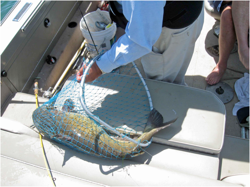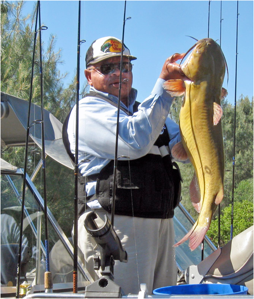 About that same time on Albert’s side of the boat (left, remember) his rod bent way over. We thought he might have gotten hooked on a stump. As he tried to reel in his line he claimed that it moved. But the rod tip was so steadily bent as he reeled in, I thought he was probably dragging a log. His line was quite a ways out so it took at least fifteen minutes to finally drag it in. I had the net out when I finally saw it – a huge catfish! Albert was trying to get it to the net without breaking the line and I didn’t want to disappoint him. I finally got the net under the catfish. It took the two of us to haul it onto the boat.