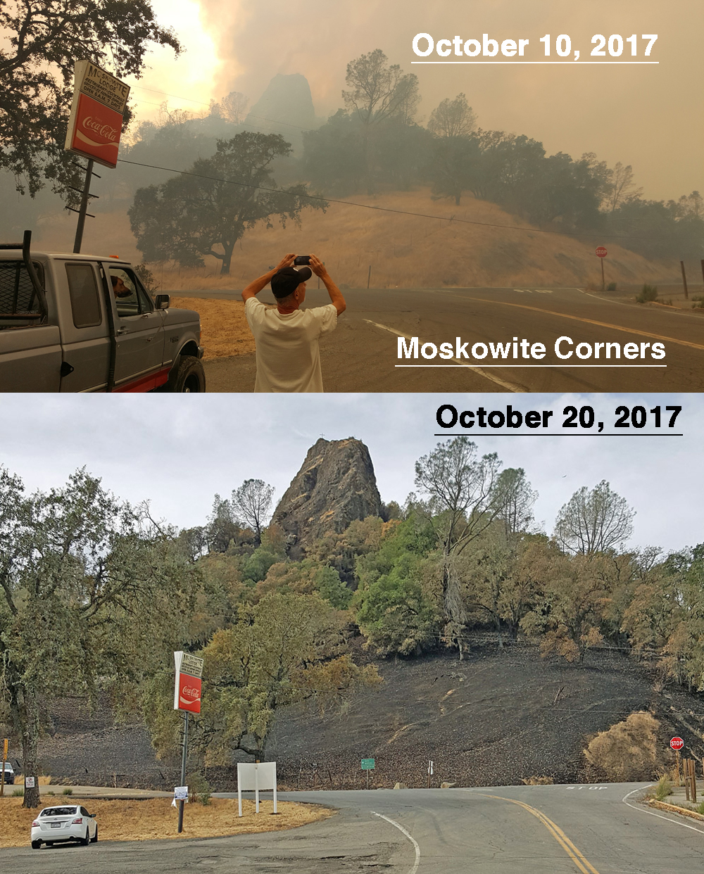 But later Tuesday night the raging fire bore down on the Capell Valley community only a few miles from the Corners and Lake Berryessa. The Pridmore family, alongside a dedicated crew of neighbors and friends, had stayed behind to save their homes. Swirling gusts of wind had whipped hundred-foot flames into a semi-circle around the valley. The group used bulldozers and water tenders to cut fire lines and douse homes in water and were successful in beating back the flames, not just on Tuesday night but for days after. Their efforts, alongside teams of firefighters, saved all but one home in the valley. They also slowed bit didn’t stop the fire as it burned upward over the ridge between Lake Berryessa and the Berryessa Highlands. You can see the battle in a KCRA report on YouTube at: https://youtu.be/jwm8CEk0uUQ