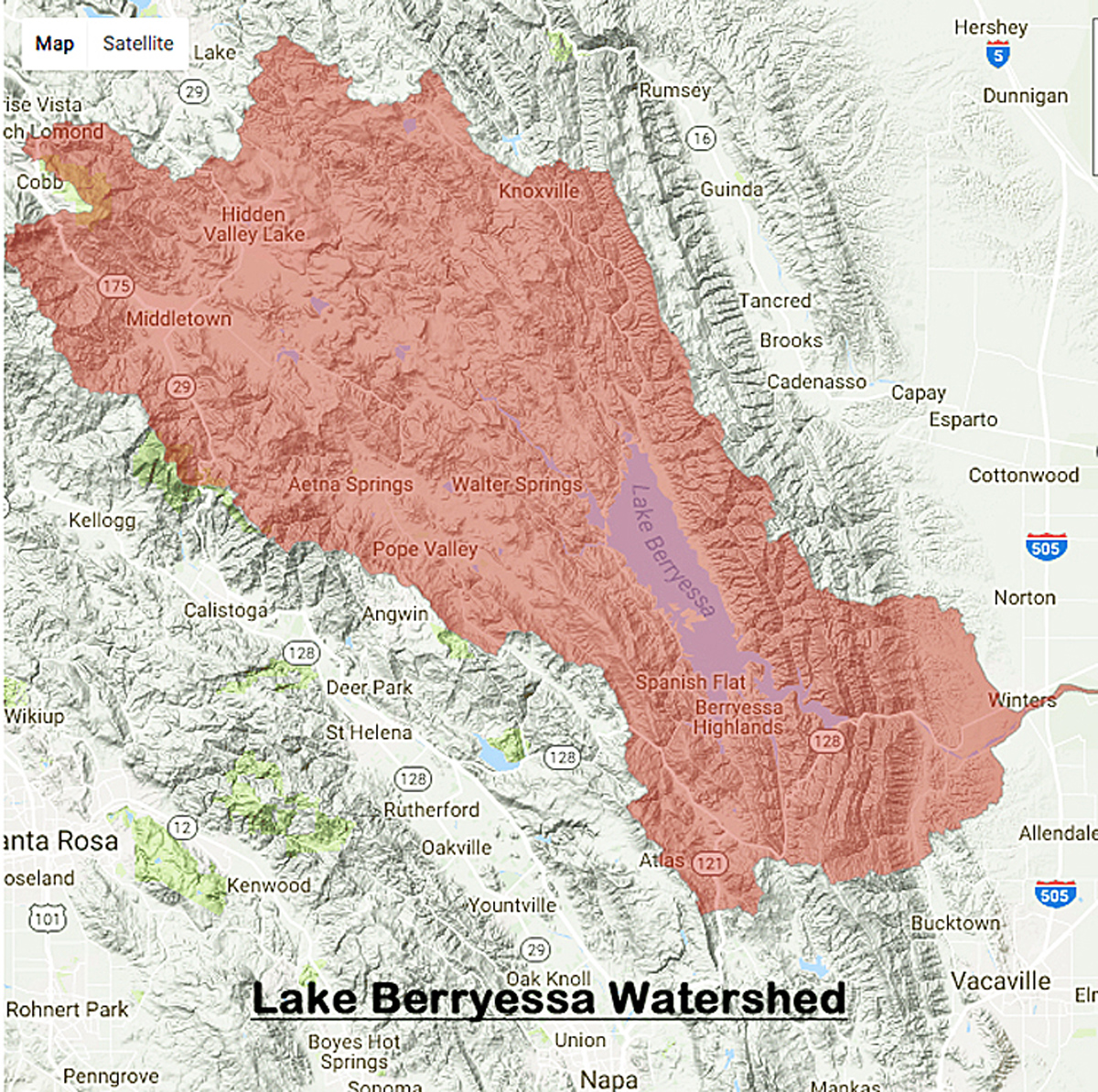 The Lake Berryessa water supply is derived from the 568 square mile drainage basin above the dam. The elevation of the basin ranges from 182 feet at the dam to 4,722 feet at the upper end of Putah Creek with most of the basin lying below 1,500 feet. There are four principal creeks that flow into Lake Berryessa: Capell Creek, Pope Creek, Eticuera Creek, and Putah Creek, the main drainage of the basin. The climate of the basin is mild and composed of two seasons, a warm dry season from May through October and a cool wet season from November through April. Most of the precipitation occurs as rain during the cool wet season with only minor amounts of snow on the upper portions of the basin .